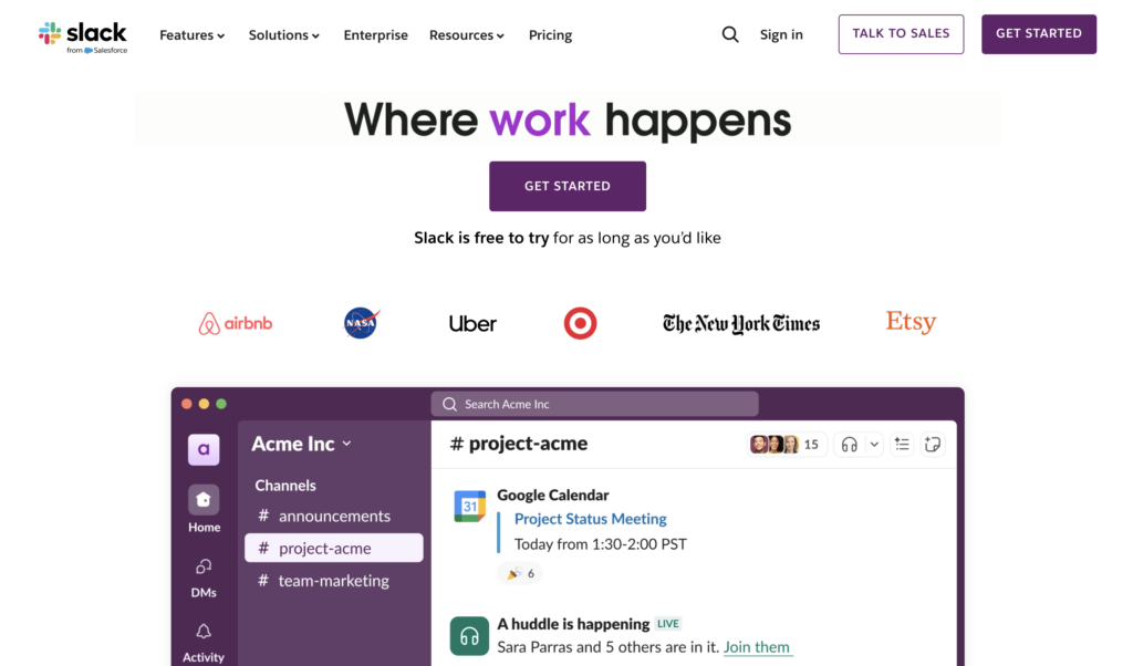 • Example (Good): Slack uses a simple message: “Slack is where work happens” with a prominent “GET STARTED” button that draws attention immediately.