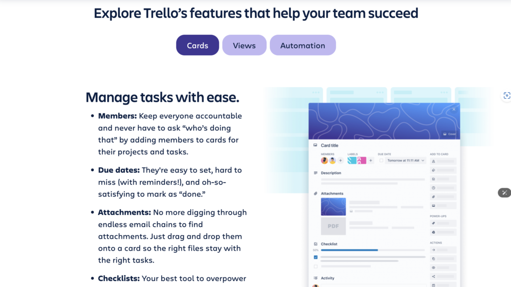 • Example (Good): Trello uses simple icons and concise descriptions to explain its features, followed by a “Learn More” button under each.